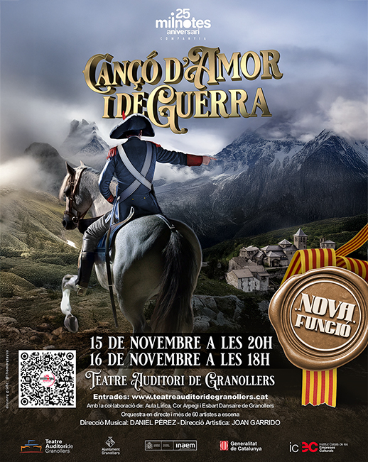 ►Cançó d’amor i de guerra torna als escenaris en una producció especial pels 25 anys de la companyia local Milnotes. Aquesta versió moderna i fidel als orígens recupera una de les sarsueles més estimades del repertori català. Amb escenografia immersiva, orquestra en directe, cos de dansa i cors professionals, l’espectacle homenatja el patrimoni musical i escènic del país. La direcció artística i musical aposta per l’excel·lència i l’emoció. És molt més que una reposició: és una celebració de la cultura compartida. Un clàssic que reneix amb força i compromís contemporani.